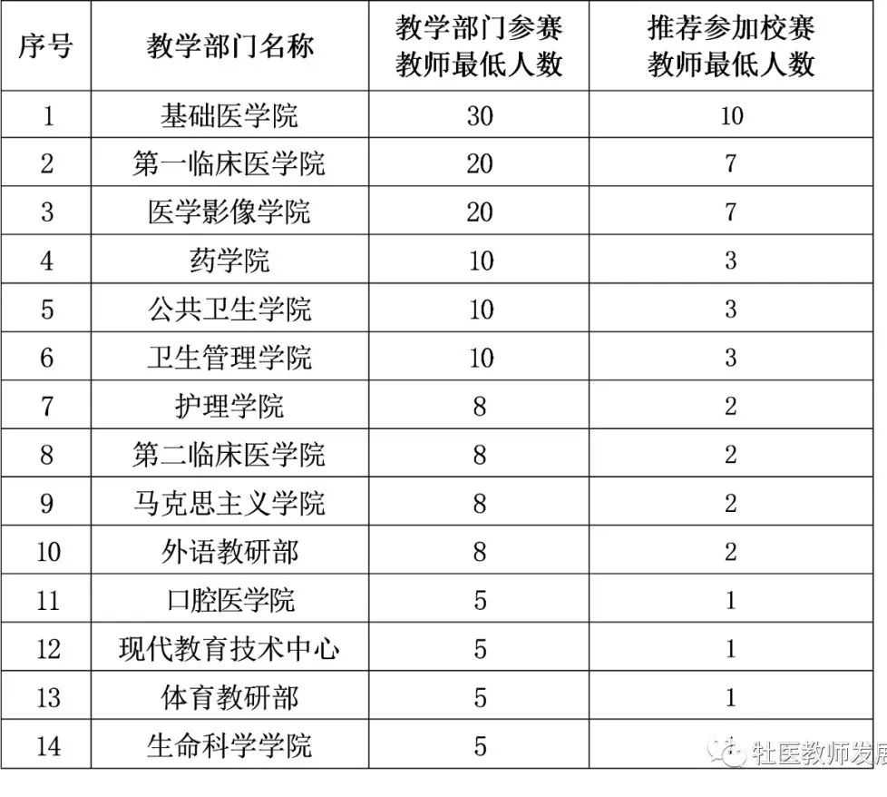 各教学部门按照赛程提前安排院级赛训环节,参与教师应不低于本部门专任教师数的20%,其中正高组人数不少于总人数的1/3(四舍五入取整),院赛形式可结合实际灵活多样,重在提升教师队伍整体教学能力。各教学部门通过初赛遴选确定参加校赛选手,各教学部门要足额推荐参加校赛个人(团队)。