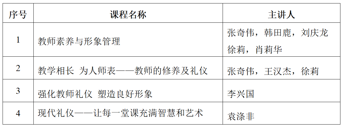 为提高新入职教师礼仪素养,树立教师良好形象,帮助广大新入职教师更好的掌握课堂教学中的教态礼仪,教师发展与教学评估中心组织“教师礼仪”专题培训,现将有关事项通知如下: