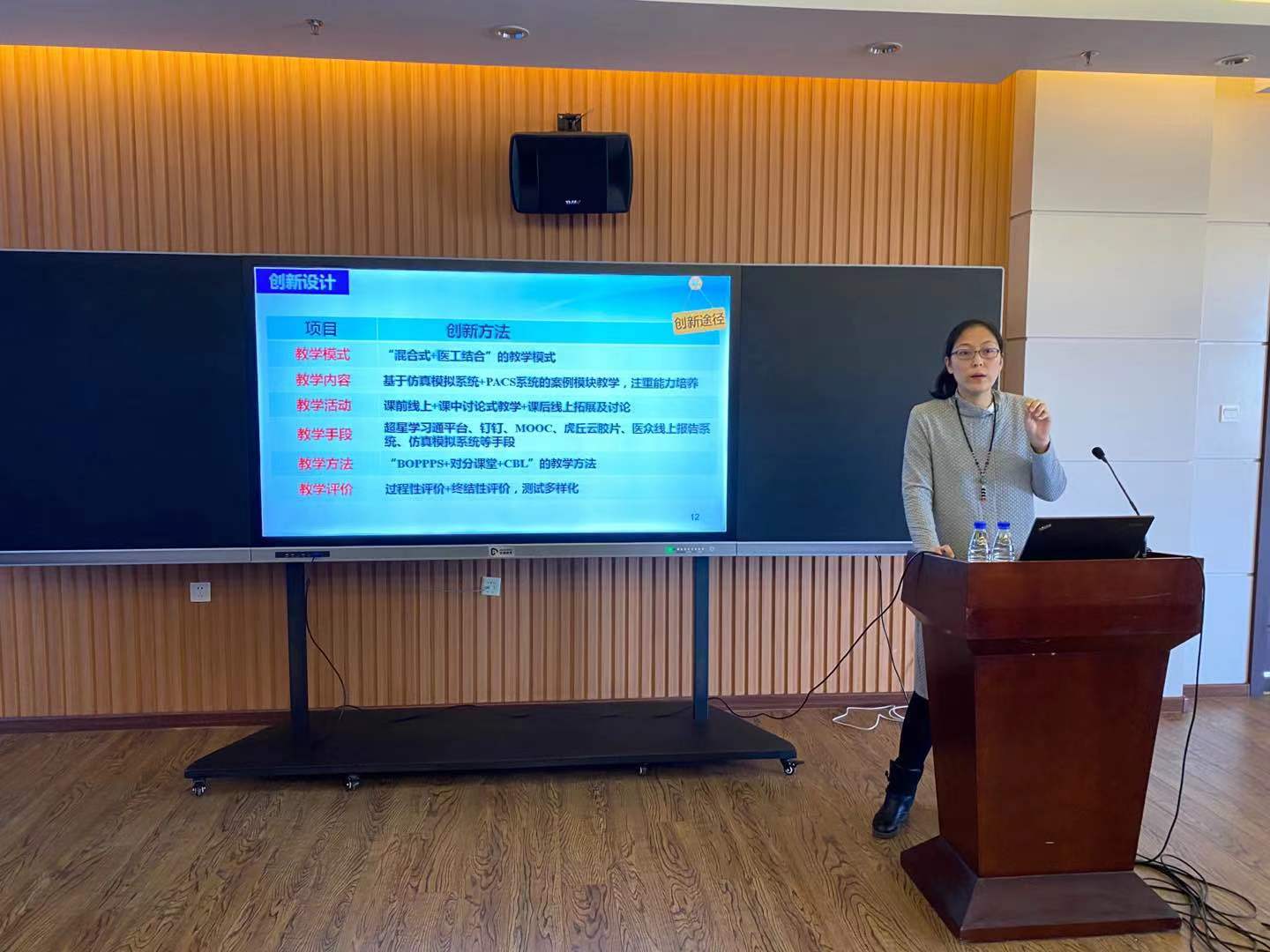 胡嘉航老师以《从教学创新大赛设计浅谈创新与实践---以影像诊断课程为例》为主题,结合创新教学大赛的经历,从教学创新大赛设计汇报、教学活动创新思路、课程思政教学设计、教学方法应用体会和参加教学创新大赛的心路历程五个方面给每一位教师在教学设计和创新上带来了新的理念认知和实践方法。胡嘉航老师采用线上自主探究+线下协作研讨有效融合的教学方式,开展“医工结合”嵌入式课堂,通过学习通学习平台、虎丘云胶片、医众线上报告系统、PACS仿真模拟系统等线上线下融合的手段,应用“BOPPPS+对分课堂+CBL”的教学方法进行课堂教学,时刻贯穿着“以学生为中心”的教育理念,完美展现了现代信息技术与教育教学的深度融合。她强调课程思政元素在课堂的植入有助于学生更加热爱自己的祖国、热爱自己的职业,同时也有助于增强学习动力。一堂精彩的授课,一个关心的眼神,一句真诚的表扬,都有助于调动学生积极性,学生学习小我和“健康中国”的大我结合在一起是课程思政的最高境界。最后,胡嘉航老师坦言参加教师教学创新大赛投入了大量的时间和精力,如果没有对教师职业的热爱,很难去克服比赛过程中遇到的困难,参加教学比赛对一名教师而言既是一次历练,更是一种提升。