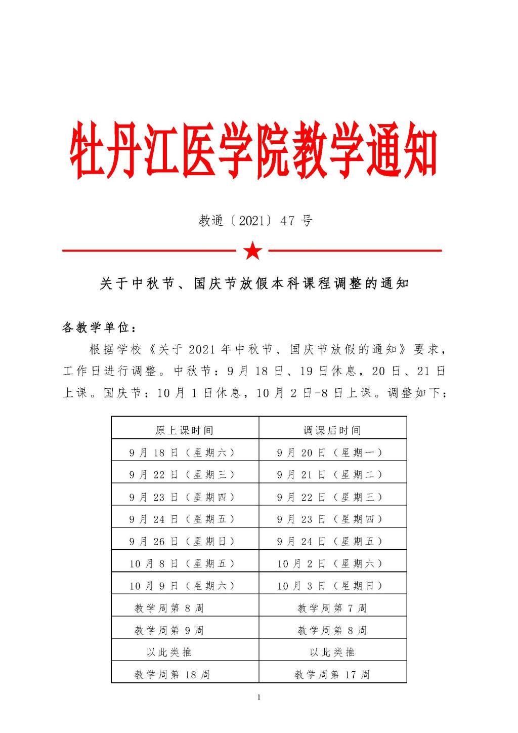 关于中秋节、国庆节放假本科课程调整的通知