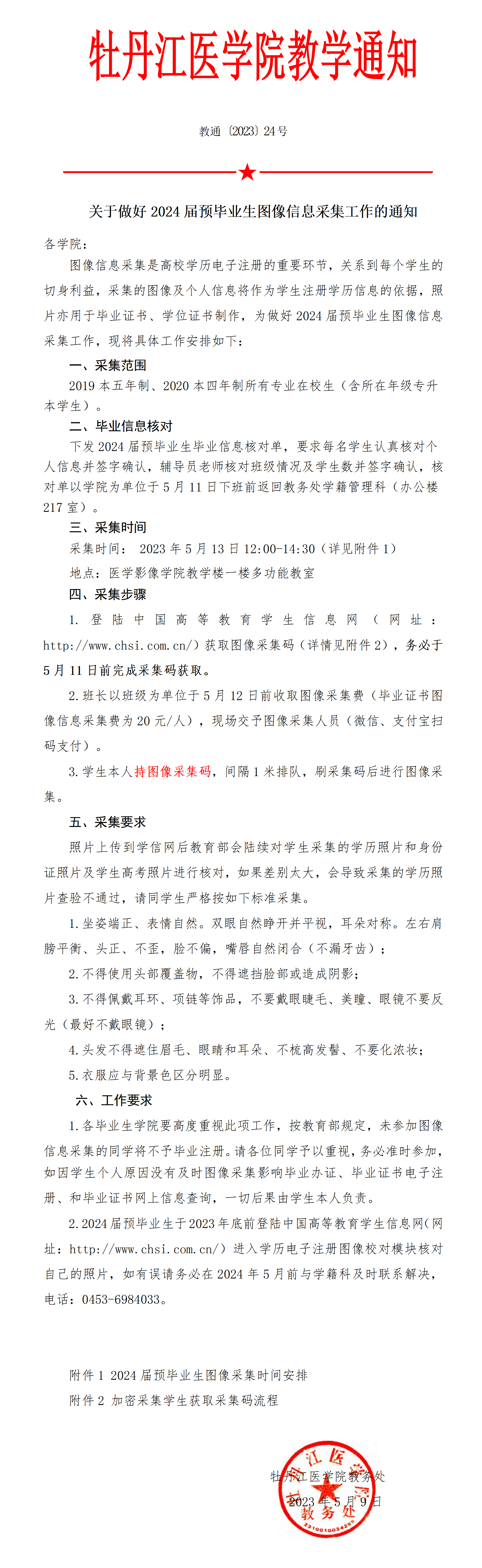 教通〔2023〕24号 关于做好2024届预毕业生图像信息采集工作的通知