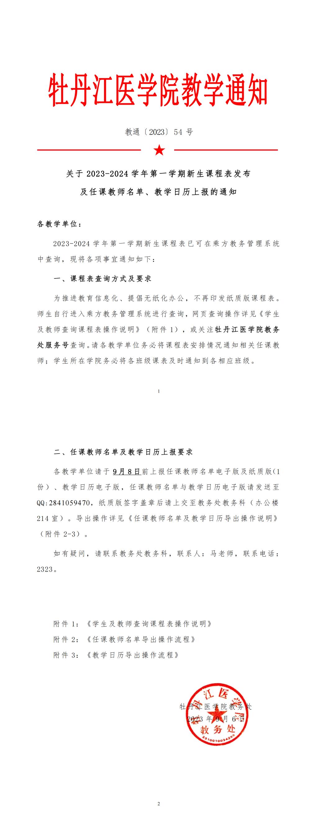 教通〔2023〕54 号 关于 2023-2024 学年第一学期新生课程表发布及任课教师名单、教学日历上报的通知