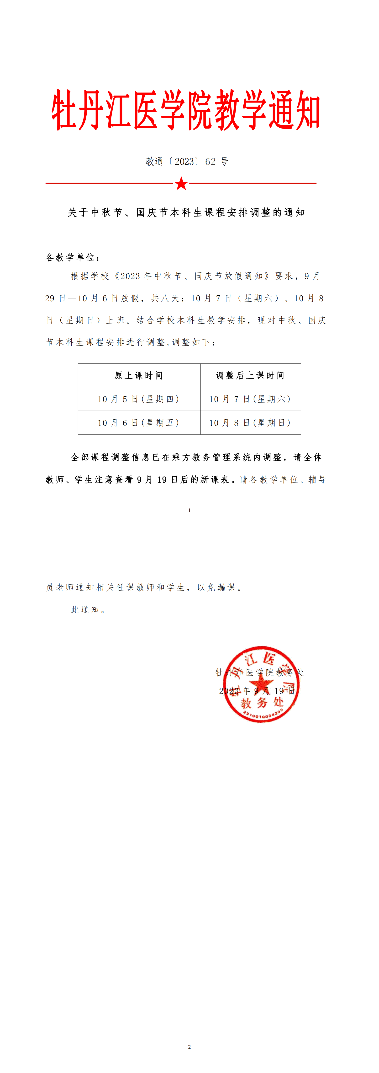 教通〔2023〕62 号 关于中秋节、国庆节本科生课程安排调整的通知