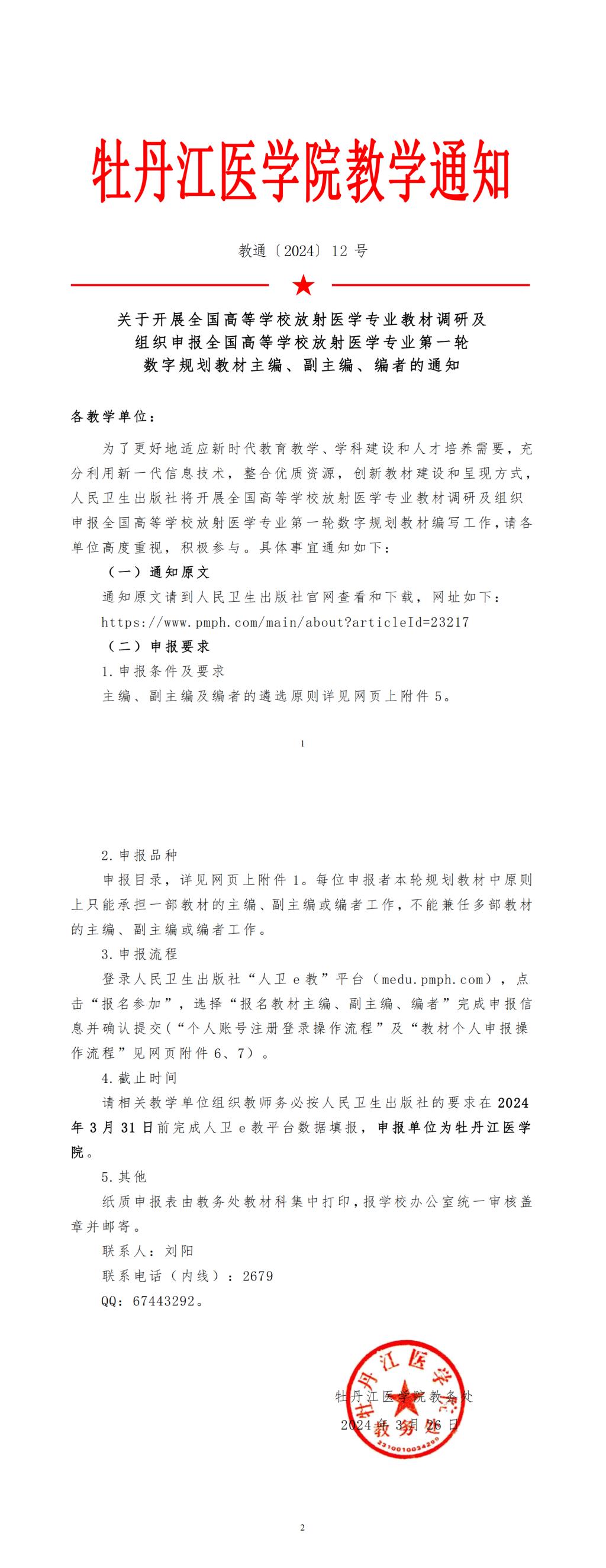 教通〔2024〕12 号 关于开展全国高等学校放射医学专业教材调研及组织申报全国高等学校放射医学专业第一轮数字规划教材主编、副主编、编者的通知
