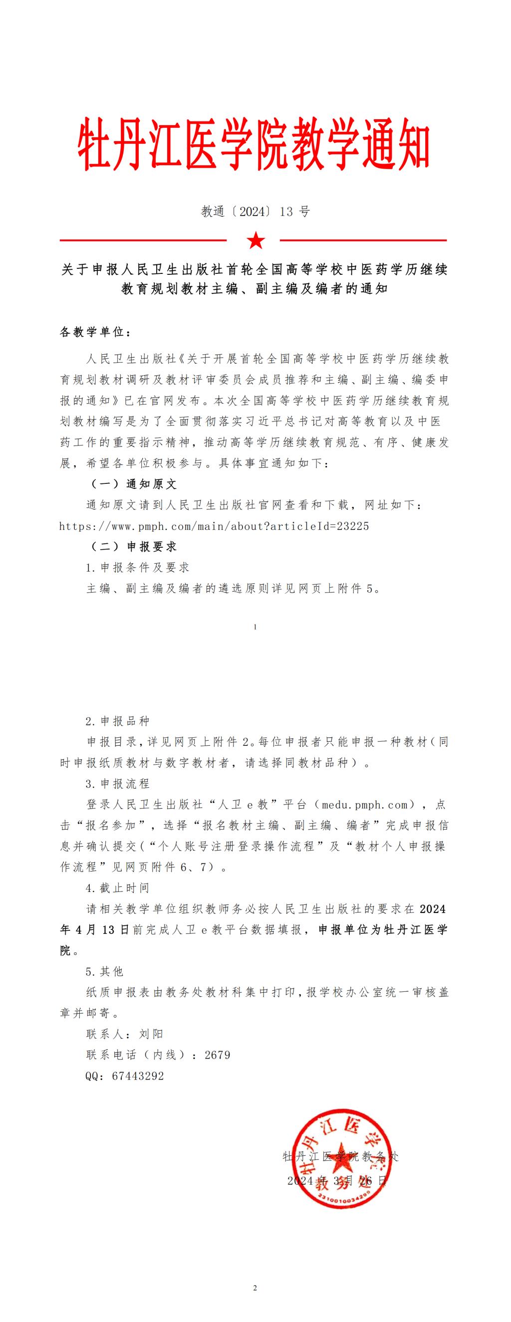 教通〔2024〕13 号 关于申报人民卫生出版社首轮全国高等学校中医药学历继续教育规划教材主编、副主编及编者的通知