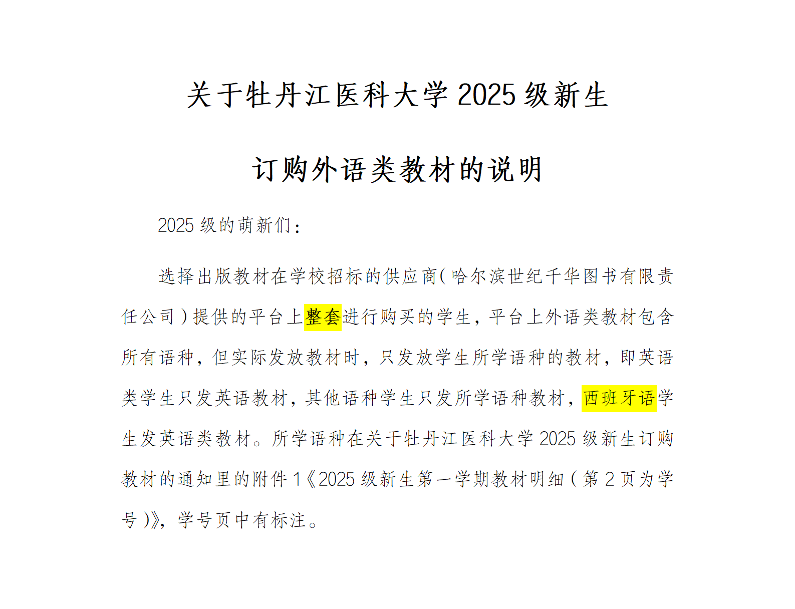 关于牡丹江医科大学2025级新生订购外语类教材的说明