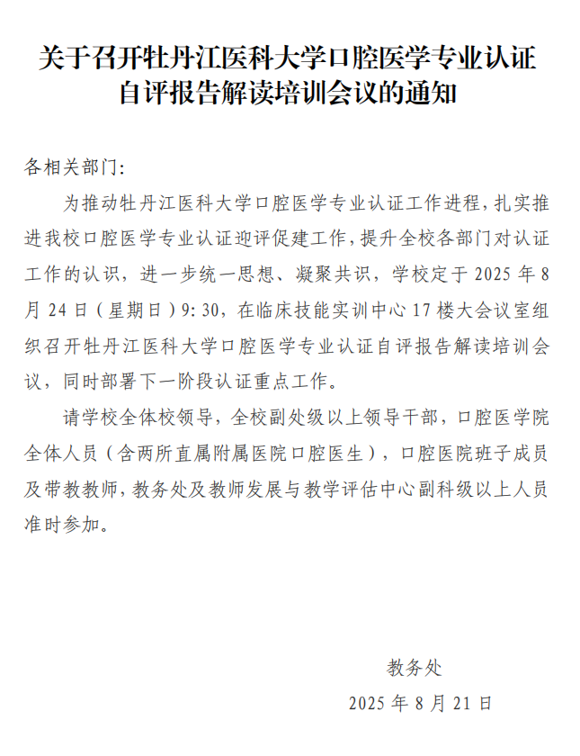 关于召开牡丹江医科大学口腔医学专业认证自评报告解读培训会议的通知