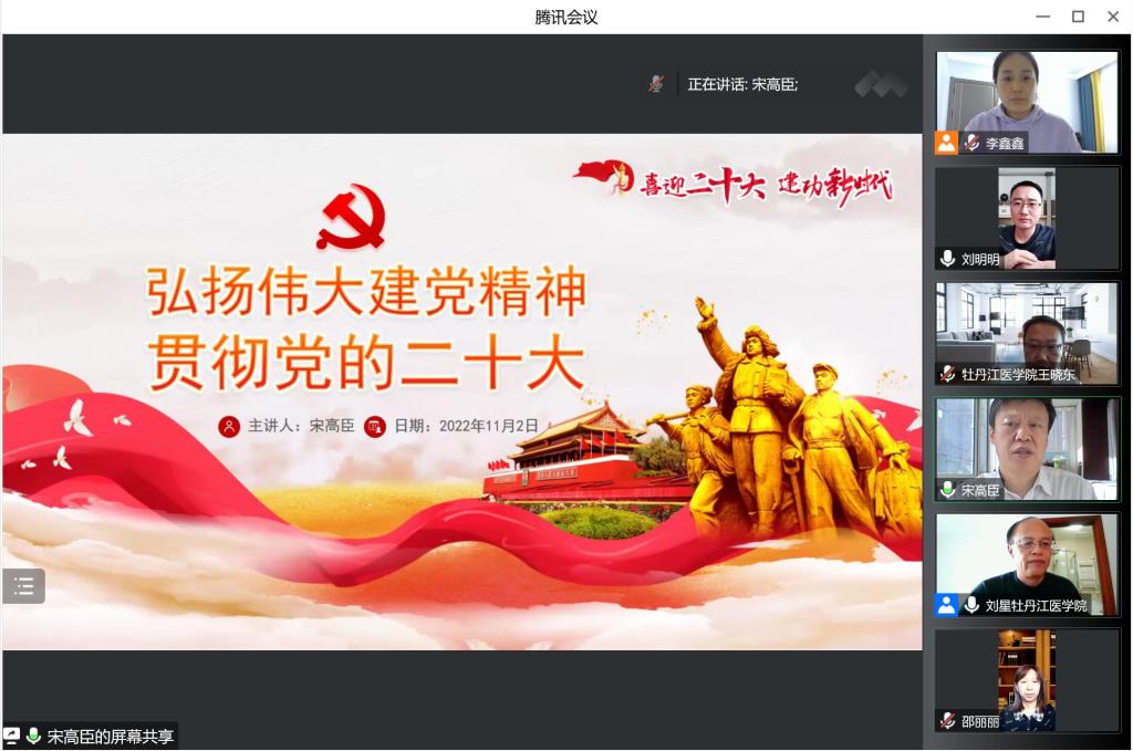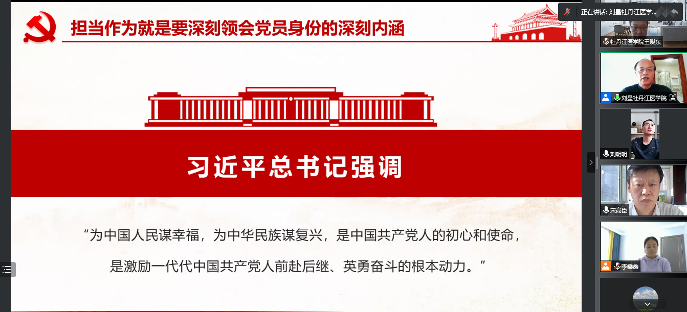 本次系列党课的主讲人分别为牡丹江医学院副校长刘星、教务处党支部书记宋高臣。刘星副校长首先进行了以“牢记党员身份、坚定信心信念,在持续提升作风建设中担当善为”为主题的党课宣讲。刘星校长从担当善为就是要牢记党的光辉历史和优良传统,担当作为就是要深刻领会党员身份的深刻内涵,担当作为就是要讲规矩、守纪律、转作风、树形象三个方面进行了论述讲解。表示我们作为共产党员,要清醒认识“我是谁”,坚守党性、服务人民;要深刻知道“为了谁”,牢记宗旨、牢记责任、牢记目标;要坚守人民至上宗旨信念,时刻不忘我们党来自人民、根植人民、服务人民;要不断增进同人民群众的感情,在为民造福中实现我们的人生价值,在无私奉献中实现我们的人生理想。并在最后强调全体党员要自觉把本次党课精神贯穿到日后的实际工作中去,转化为加快学校教育事业发展的强劲动力,增强政治意识,提升业务能力,加强工作作风,扛起责任,主动担当,在攻坚克难中提升能力,在真抓实干中转变作风,推动学校高质量内涵式发展。