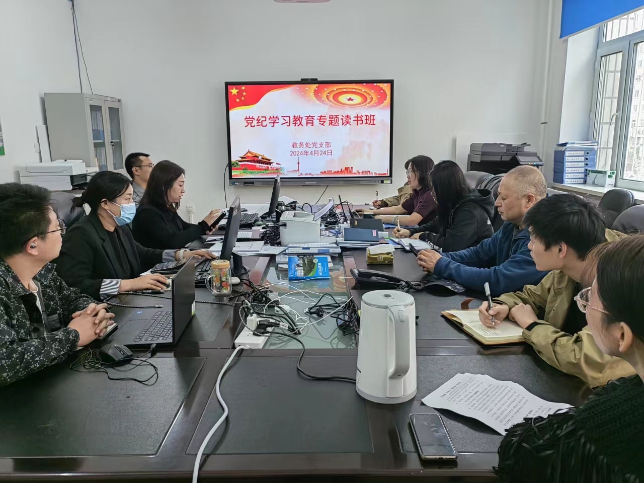 为深入贯彻落实学校党委关于开展党纪学习教育的部署及机关党委具体要求,4月24日下午,教务处党支部组织开展党纪学习教育专题读书班活动,全体党员干部参加会议,会议由党支部组织委员王晓东主持。