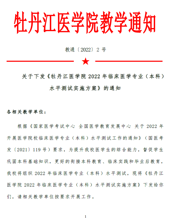 教通〔2022〕2号关于下发《牡丹江医学院2022年临床医学专业(本科)水平测试实施方案》的通知