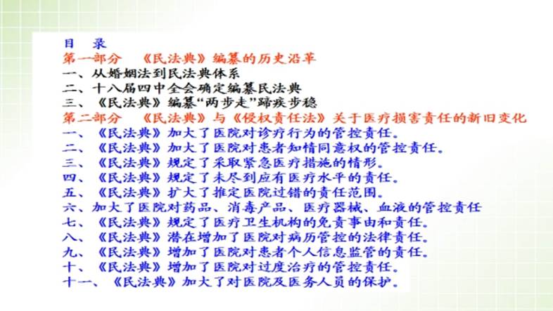 重点讲《民法典》第七编侵权责任第六章医疗损害责任(第1218条至第1228条)与《侵权责任法》第七章医疗损害责任(第54条至第64条),这两部法律对医疗损害责任的规定均是11个条文,但条文所规定的内容有增有减。针对《民法典》第六章医疗损害责任 第1218-----1228条与《侵权责任法》第七章 医疗损害责任54—64条比较。课程思政----倡导“文明、和谐”的医患关系。使学生学法、知法、守法,并依法支持和配合疫情防控工作.面对依法治国增强法律意识遵守医药卫生法律、法规。增强事业心、责任感和依法执业监督意识,恪守医疗服务职业道德为将来的依法执业打好基础。