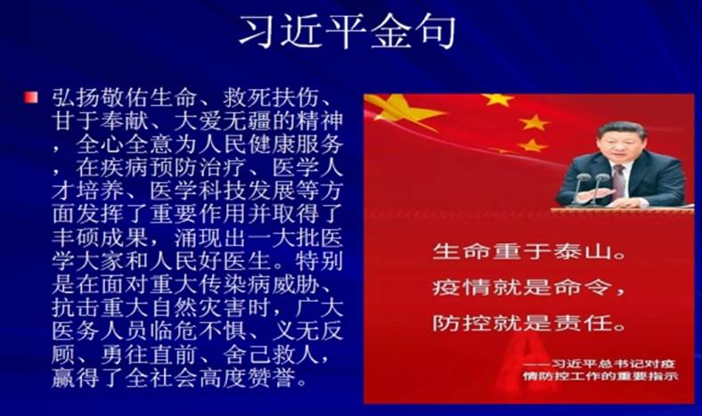 课程反思:2016年8月19日,新世纪第一次全国卫生与健康大会隆重召开,习近平总书记发表重要讲话,明确了卫生与健康工作在党和国家事业全局中的重要位置和新时代卫生与健康工作方针,是中国特色卫生与健康事业发展史上的里程碑。以此为标志设立“中国医师节”,体现了以习近平同志为核心的党中央对1100多万卫生健康工作者的关怀和肯定。2017年11月3日,国务院通过了卫计委关于"设立中国医师节"的申请,于11月20日发布批复文件,同意自2018年起将每年8月19日设为"中国医师节"。2018年8月17日,习近平对首个“中国医师节”作出重要指示强调:弘扬救死扶伤的人道主义精神,不断为增进人民健康作出新贡献。2019年8月19日是第二个中国医师节,2019年中国医师节的主题是“弘扬崇高精神,聚力健康中国”。2020年8月19日是第三个中国医师节。中共中央政治局常委、国务院总理李克强作出重要批示。批示指出:白衣天使,大爱无疆。新冠肺炎疫情发生以来,广大医务工作者舍己忘我,勇挑重担,全力以赴投身疫情防控,全力以赴救治患者,为保护人民群众生命安全和身体健康作出了突出重要贡献。全国抗击新冠肺炎疫情表彰大会在京隆重举行