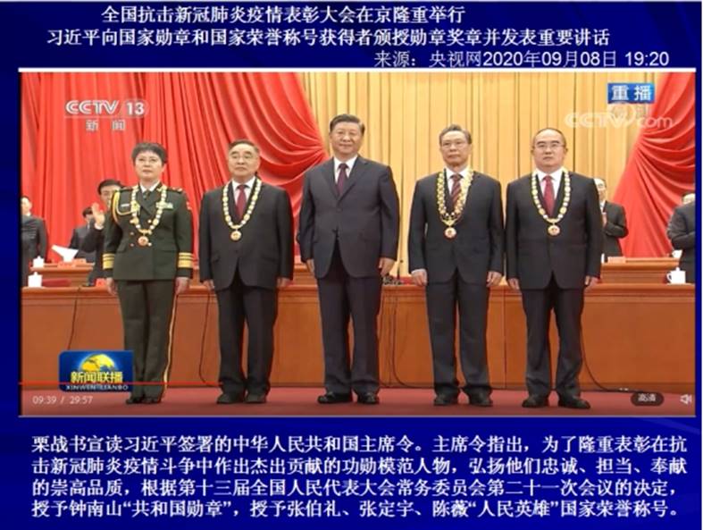 “全国抗击新冠肺炎疫情表彰大会”授予钟南山“共和国勋章”,授予张伯礼、张定宇、陈薇“人民英雄”国家荣誉称号。
