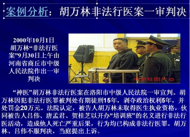 以“胡万林非法行医”案例分析以案说法,依法定罪。拓展学生的知识面,提高学生运用知识分析问题、解决问题的能力。引导学生秉承医生职业道德规范作为医务工作者,应时刻为病人着想,救死扶伤,实行社会主义的人道主义。严谨求实,奋发进取,钻研医术,精益求精。引导学生作为公共管理者了解医院管理手段,培养严谨求实,奋发进取,钻研医术,精益求精的精神。不断更新知识,做合格的医药卫生管理者。同时如何防止医疗暴力事件频发?医务工作者应怎样维护自己的权益?预防、打击医疗暴力,不能“以暴制暴”,更不能搞“罚治”,而应坚持法治思维,采取法治方式,完善相关立法。遏制医疗暴力呼唤呼吁出台反医疗暴力法。