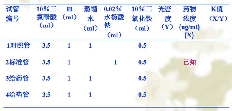 三.实验方法 1.取4支离心试管,按1-4编号,分别加入10%三氯醋酸3.5ml。 2.取家兔一只,耳缘静脉iv,(25%乌拉坦,4ml/kg)麻醉,固定,分离气管及一侧颈A,气管插管,颈A插管(肝素化),备放血。 3.打开A夹,放血2ml,分别置入1,2号试管各1ml,摇匀静止。 4.耳缘缓慢注入10%水杨酸钠(2ml/kg) ,给药后10和60分钟分别放血1ml,置入3,4号试管各1ml,摇匀静止。 思考:为什么要缓慢注射水杨酸钠?若出现哮喘应怎样抢救? 引入思政: 临床急救知识:针对本次实验关于呼吸系统疾病的急救,对症以及对因治疗的的方法和原则,以及相关药物和急救措施。 5.向2号试管内加入1ml 0.02%水杨酸钠,1、3、4号试管内分别加入1ml蒸馏水,摇匀后将4支离心试管放入离心机内,离心5分钟(1500-3000转/分)使血浆蛋白沉淀。 6.取离心后的上清夜分别一次性倒入第二组相应编号的4支试管,从第二组试管内分别准确移取上清夜3ml置入第三组相应的4支试管内,最后向第三组4支试管中分别加入10%Fecl3 0.5ml摇匀显色。 7.以1号管为对照,用7230分光光度计在波长520nm处测定其余三管的光密度(Y)并计算血药浓度(X)。 8.根据公式T1/2=0.301/[(lgX3-lgX4)/∆t 计算T1/2 式中X3,X4分别为给药10和60分钟的血药浓度;∆t为两次取血间隔时间(即50分钟)。 引入思政: 团队合作精神:讲解什么是向心力、凝聚力和奉献精神。团队里成员相互协作,利用个性和能力差异,在团结协作中实现优势互补,发挥积极协同效应,提高效率!带来"1+1>2"的效应。 四、实验结果 计算得出X2,X3,X4,T1/2填表