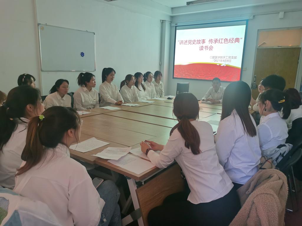 为深化四史学习,诵读红色经典,传承革命精神,献礼建党百年华诞,口腔医学院学工党支部于2021年4月9日晚五点十五分在党员之家组织开展了红色读书会。