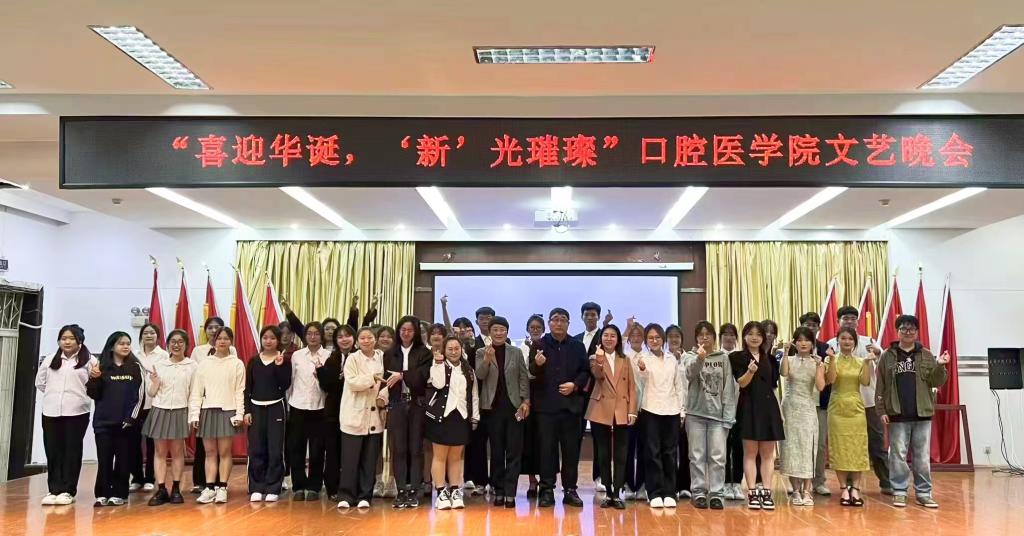 为热烈庆祝中华人民共和国成立75周年,弘扬爱国主义精神,丰富学生校园文化生活,喜迎2024级新同学,口腔医学院于2024年9月25日晚在基础楼六楼多功能厅举办以“喜迎华诞,‘新’光璀璨”为主题的文艺晚会。口腔医学院党总支书记钱锐、党总支副书记关跃、辅导员宋颜竹及教师代表出席活动。