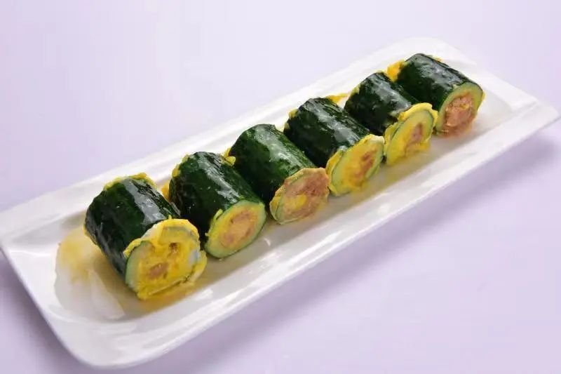 制法:黄瓜洗净,取中段,用专用戳刀将黄瓜瓤捅掉,形成黄瓜筒。放入开水锅内烫2分钟,捞出后放入冰水中浸泡。在牛肉馅里放入备好的麦冬粉、黄酒、胡椒粉、芝麻油、菱角粉、鸡蛋液、毛生姜水以及食盐1.5克,搅拌均匀,调好牛肉馅。将黄瓜筒从水中捞出,沥干水分后在内壁撒上干面粉,再将调好的牛肉馅用小勺填满黄瓜筒。用面粉和鸡蛋调成鸡蛋糊,将黄瓜筒的两头封住。将黄瓜筒放入热油锅,煎至鸡蛋糊微熟取出,放入盘中加食盐0.5克,入笼蒸20分钟,蒸熟后取出。将黄瓜筒切成3至4段,盛在深盘中,将蒸黄瓜煮步骤的原汁倒入锅内,置火上烧热,勾淀粉芡,淋在黄瓜筒上即可。