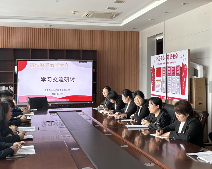 为深入学习并贯彻《中国共产党纪律处分条例》,践行新时代廉洁文化,马克思主义学院直属党支部引导全体党员干部教师坚守廉洁自律底线,筑牢拒腐防变思想防线,6月27日召开了廉洁警示教育培训大会。培训采取支部书记讲党课,纪检委员领学,观看警示教育片、党员教师交流研讨以及小组党员自学等方式开展培训。