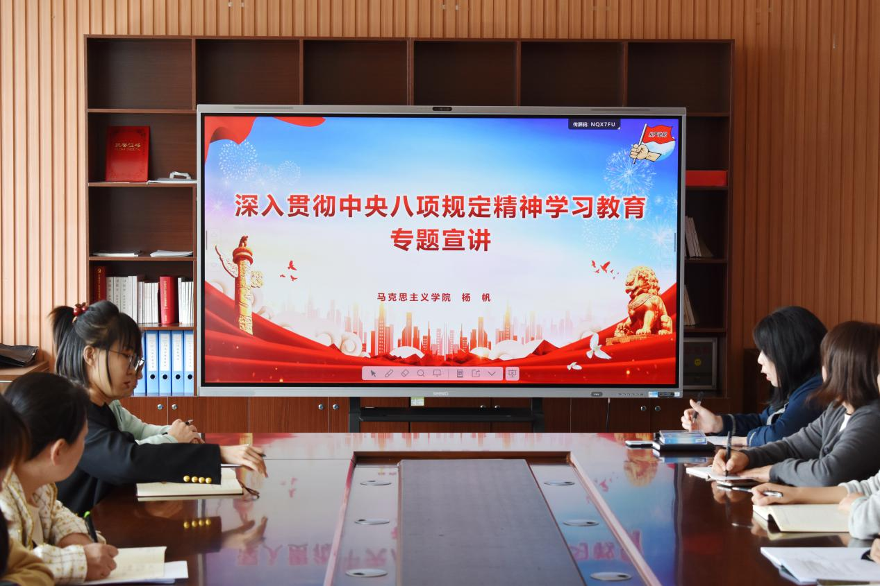 为深入贯彻党中央全面从严治党的战略部署,扎实推进党风廉政建设,2025年5月6日下午,马克思主义学院党总支书记杨帆开展了深入贯彻中央八项规定精神学习教育专题党课宣讲。学院全体教职工参加,本次宣讲旨在强化纪律意识,营造风清气正的学院环境。