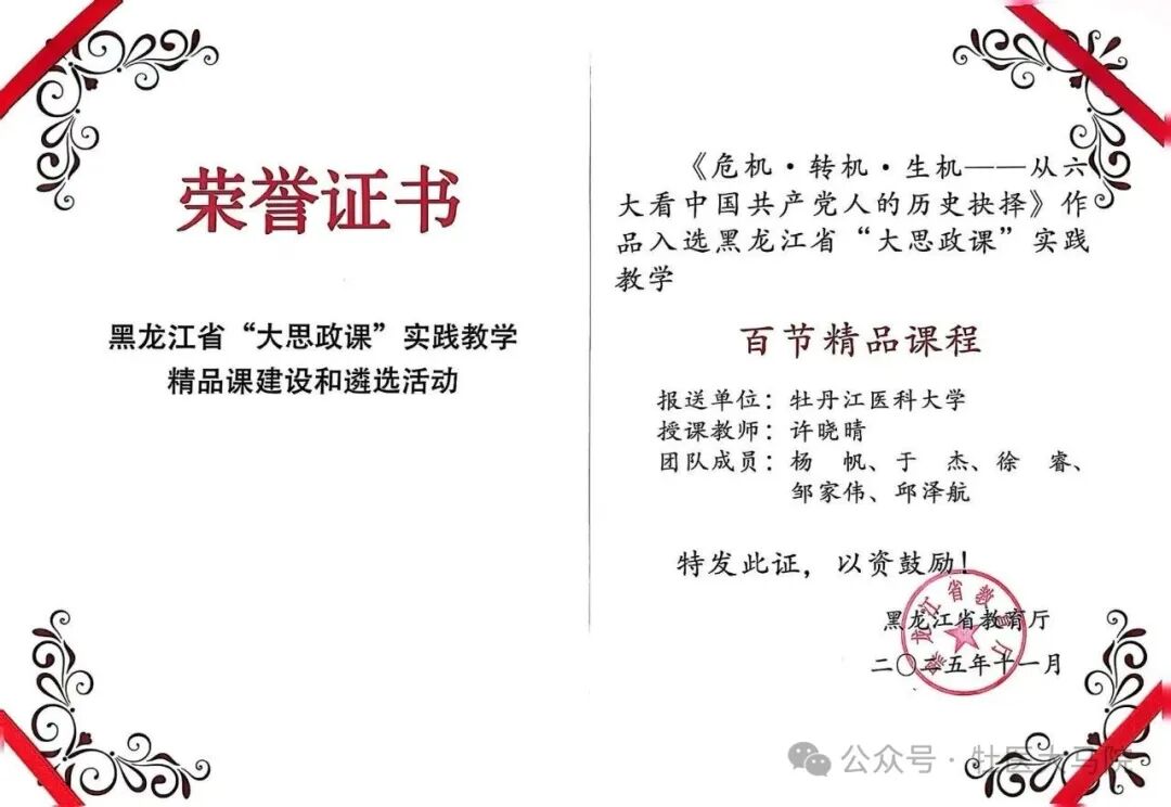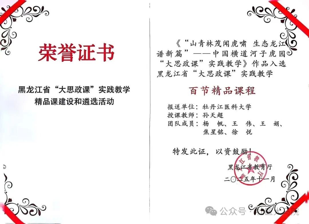 11月29日上午,黑龙江省“大思政课”实践教学精品课程展示会在东北农业大学召开,经过两个多月的层层遴选,我省“大思政课”实践教学“百节精品课程”名单在本次会议上揭晓,我校马克思主义学院报送的两个作品全部成功入选“百节精品课程”。它们分别是许晓晴老师主讲的《危机·转机·生机:从六大看中国共产党人的历史抉择》和孙天超老师主讲的《“山青林茂闻虎啸 生态龙江谱新篇”--中国横道河子虎园“大思政课”实践教学》,这既展现了我校思政课教师理论与实践相结合的扎实专业功底,也体现了我校在推动“大思政课”建设方面的显著成效。