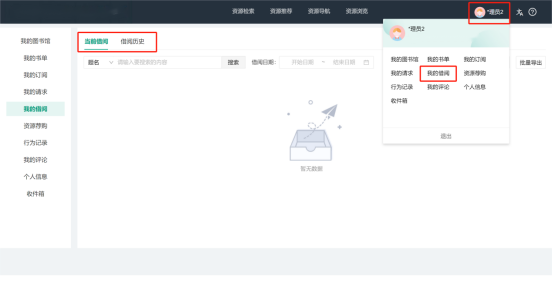 登录后读者通过右上角点击“我的借阅”即可查询当前借阅信息和借阅历史,可按照借阅规则规定进行图书续借