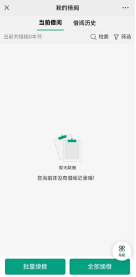 点击我的借阅,查询在借图书信息和借阅历史信息,可按照借阅规则规定进行图书续借