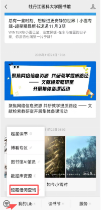 微信公众号关注牡丹江医科大学图书馆,关注后在下方选择“我的Lib”中的“馆藏借阅查询”