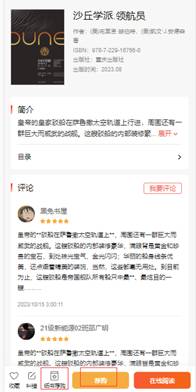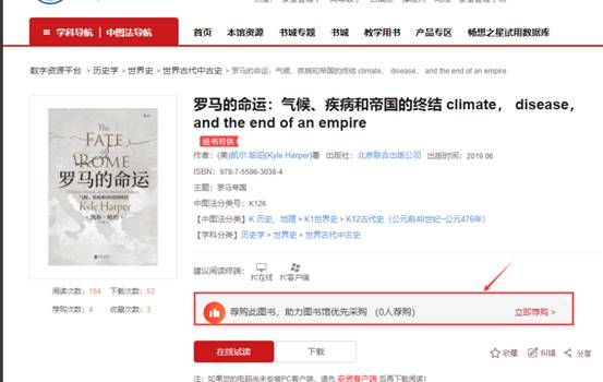 书城资源中本馆未开通试用的电子书,点击进入图书详情页,可以“在线试读”,读者感兴趣的电子书可以点击“荐购”推荐给图书馆购买。