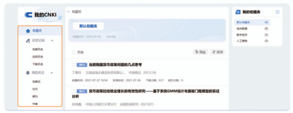 可进入“我的CNKI”享个性化文献管理服务。包括:收藏文献,查看历史记录关注检索式、论文、期刊、作者。