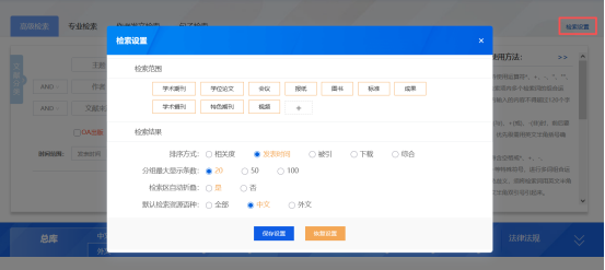针对总库检索,提供检索设置功能,读者可根据个人使用习惯进行数据库检索范围、检索结果显示的偏好设置,方便操作。