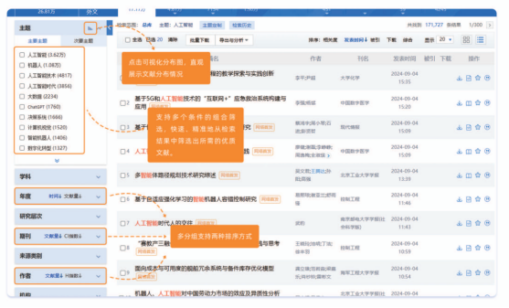 知网为临床医学研究提供了专业化的检索工具。除常规的一框式检索、高级检索外,其特色在于嵌入了医学专业主题词智能系统,与国际接轨的MeSH词表支持专业词汇的主题词检索,大幅提升查准率。以高级检索为例,第一步,精准关键词组合,研究者要明确检索主题,正确使用医学领域的专业术语作为关键词,根据研究内容确定核心关键词进行组合,提高查准率。第二步,优先筛选高质量文献,由两部分组成。一是通过学科、基金、作者等进行分组,按发表时间、被引频次、下载频次排序,便于筛选高质量文献。二是利用知网节功能则通过参考文献、引证文献、共引文献等链接,将相似文献标题、摘要等进行相关排序,从而完成结果筛选。