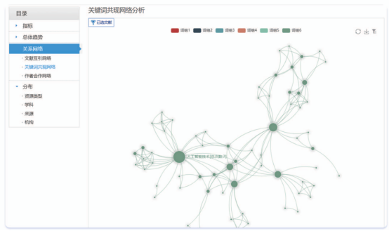 关键词共现网络是以文献的关键词为节点,以关键词共现关系为基础构建关键词共现网络。通过关键词共现可以分析所选文献的主题,即所选文献主要研究的内容。