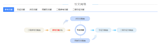 引文网络部分包括:二级参考文献、参考文献、引证文献、二级引证文献、共引文献、同被引文献,使知识由一个独立的点扩展成互相关联的庞大网络,拓宽知识发现的范围。