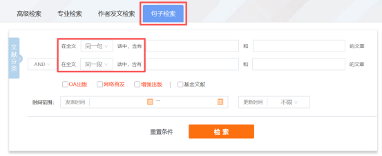 在高级检索页切换“句子检索”。句子检索是通过输入的两个检索词,在全文范围内检索同时包含这两个词的句子,检索到有关论文。