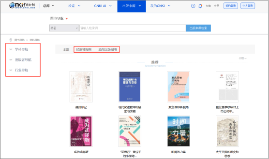 实现图书资源的单独检索。通过切换左侧的学科导航、出版者导航和行业导航栏,可找到不同学科、出版社和行业分类的图书,通过点击“全部”“经高核图书”“原创出版图书”标识,可以切换检索图书的来源范围。