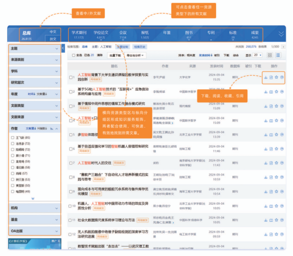 学术期刊、学术辑刊、会议、学位论文文献知网节的页面为三栏结构,从左到右分别为文章目录:题录摘要信息和引证文献。其他单库产品的知网节多为单栏结构。