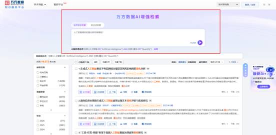 万方智搜全面从各个方面拥抱AI。AI增强检索让您无需再为构造复杂的检索式发愁。在检索框中直接输入自然语言,系统会自动识别意图,智能解析为检索表达式,字段和运算符一目了然。