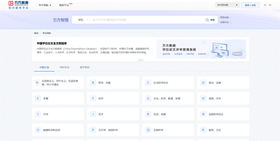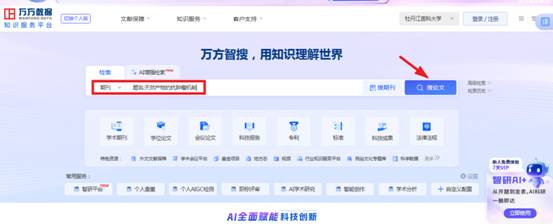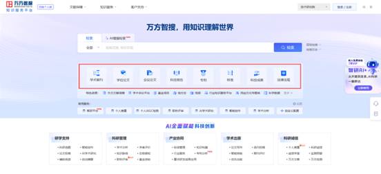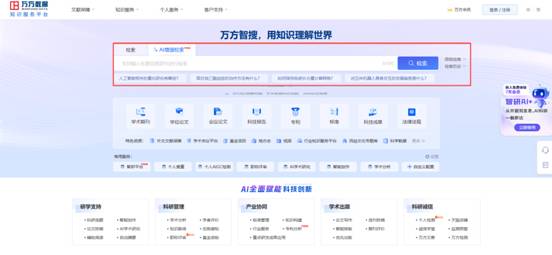 核心检索区:集成了搜索框、AI增强检索和高级检索,提供各类型资源与特色资源的导航页入口,并设置了万方其他产品的快捷入口,方便使用。