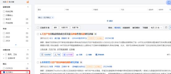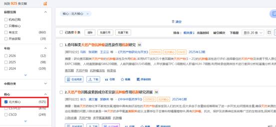 检索结果:①被北大核心期刊收录关于“天然产物的抗肿瘤机制”文献925篇.