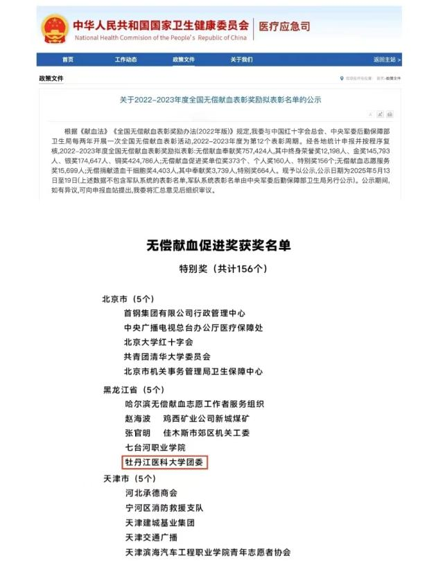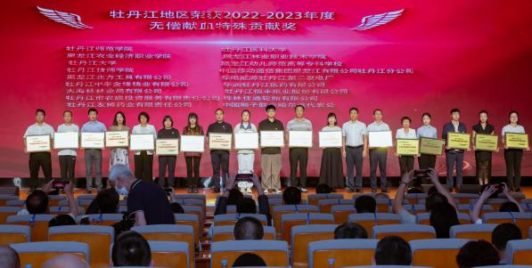 6月13日,在第二十二个世界献血者日来临之际,牡丹江市无偿献血表彰大会在牡丹江师范学院教师教育实训楼报告厅隆重举行,我校在无偿献血公益事业领域再获佳绩。其中,学校荣获2022—2023年度牡丹江市无偿献血特殊贡献奖,校团委荣获2022—2023年度全国无偿献血促进奖特别奖,这是继我校在无偿献血领域多次获得表彰后,取得的又一重要奖项!该奖项由国家卫生健康委员会、中国红十字会总会、中央军委后勤保障部卫生局联合授予,每两年评选一次,是国家对无偿献血工作作出突出贡献单位和个人给予的最高奖项,黑龙江省仅3家单位与2名个人获此殊荣。同时,附属红旗医院与附属第二医院荣获2022—2023年度牡丹江市无偿献血应急先锋奖。