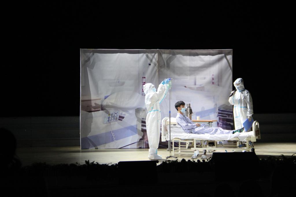 各学院参赛队伍经过一个多月的精心排练,为我们呈现了一幕幕感人至深的精彩故事。同学们入情入境,惟妙惟肖的表演,将故事情节及原型人物演绎得淋漓尽致,充分展现了在这场抗疫战斗中,医护人员以疫为令,护百姓健康、救治归国同胞,冲锋在前,创造了人类与疾病斗争史上的英勇壮举。现场观众也与演员们再次共同感受了那场惊心动魄的抗疫斗争,他们纷纷表示作为一名医学生,要继续发扬这种优秀意志品质及奉献精神,不断增强责任感、使命感,在党和国家需要的时候,挺身而出、勇往直前,彰显青春担当。经过激烈的角逐,最终卫生管理学院的《记疫》获得本次大赛金奖。