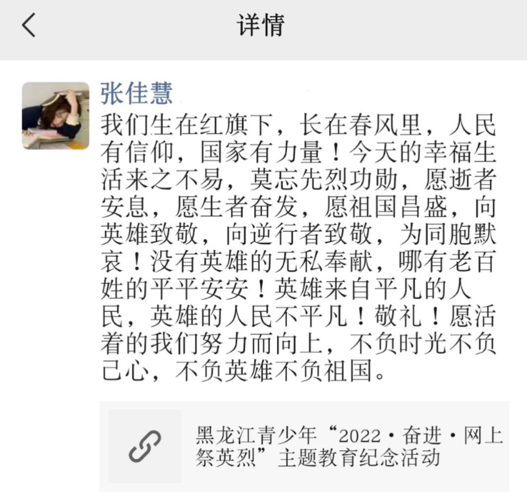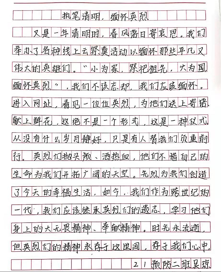 公共卫生学院推出了公卫大学习清明特辑,在三位主讲人的带领下,带领全体同学深入了解东北抗联的英勇事迹,在14年艰苦卓绝的抗日战争中,英勇的东北抗联战士们不畏环境艰苦的斗争,用生命为民族独立和人民解放立下不可磨灭的历史功勋。此外,还开展 “清明节,祭先烈”线上主题班会及理论学习、 “我们永远铭记您”主题的征文写作及献给英雄的手写信,用不同方式加强清明节文化的教育,同时,同学们以手下之笔,表达了对烈士们的深深怀念和敬意,并表示他们定将努力学习,不辜负烈士们用热血换来的今天。