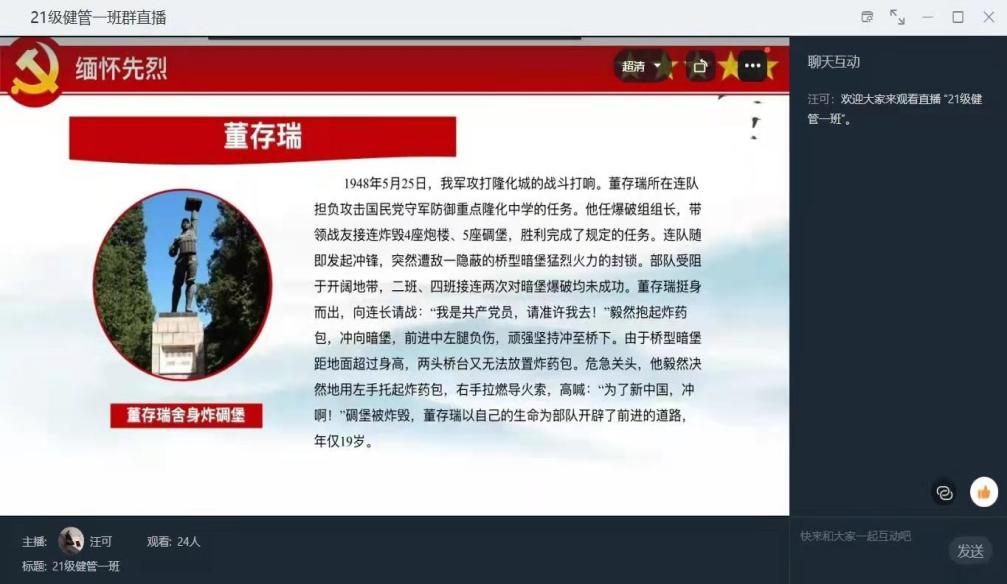 第一临床医学院开展“弘扬英烈精神 赓续精神血脉”主题云团课学习活动和“今天为英烈献花”主题的直播学习活动,该活动由共青团黑龙江省委员会主办,并由哈尔滨烈士陵园承办的网络直播,围绕作为全国兴建较早的烈士陵园--哈尔滨烈士陵园,以讲解员视角,带领青少年走进烈士陵园,参加升旗仪式,聆听英烈故事,回顾峥嵘岁月,深切缅怀革命先烈丰功伟绩。此外,清明节期间,还组织学生开展“清明追思、缅怀先烈”线上清明节诗词诵读活动,寄托哀思,共同继承先烈遗志,坚定理想信念。