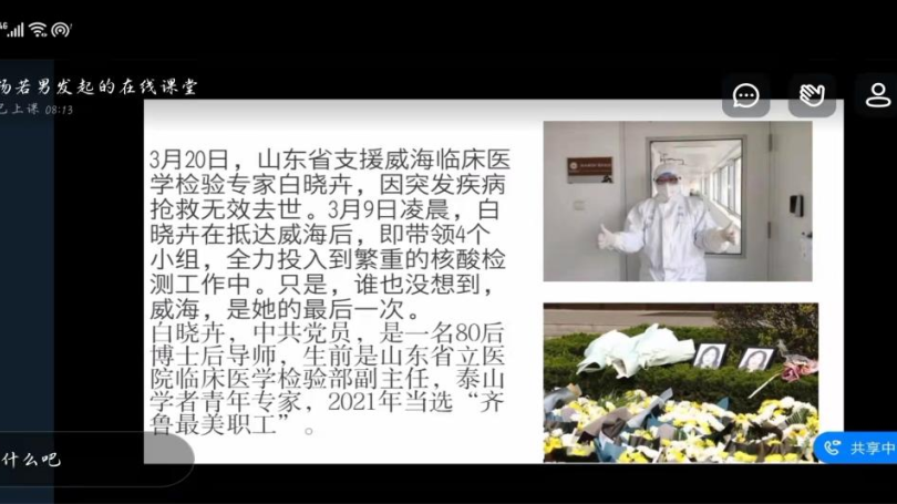 药学院在清明节期间,组织开展学习抗疫英雄白晓卉同志的相关视频,了解了白晓卉同志自疫情以来,辗转于北京、河南等各个一线战场的先进事迹,白晓卉同志逆行出征、勇挑重担的担当精神,和志爱岗敬业、争创一流的优秀品质。开展缅怀抗疫英雄寄哀思的宣讲、主题征文活动等,以特有的方式缅怀先烈,寄托哀思。