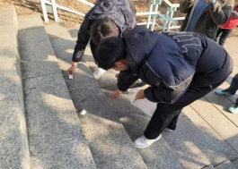 第一临床医学院的志愿者们3月4日来到金龙家园小区内,不畏寒冷清扫小广告。大家铲的铲、推的推、扫的扫,分工明确,专注地清理小区内的每一个角落,大家忙碌的身影构成了一道美丽的风景线。“慢点走,小心路滑……”在清扫之余,同学们不忘提醒在自己身边经过的居民,一句句贴心的话再加上扫帚、铲子与地面发出的摩擦声交织在一起,奏响了一首“扫雪除冰交响曲”。