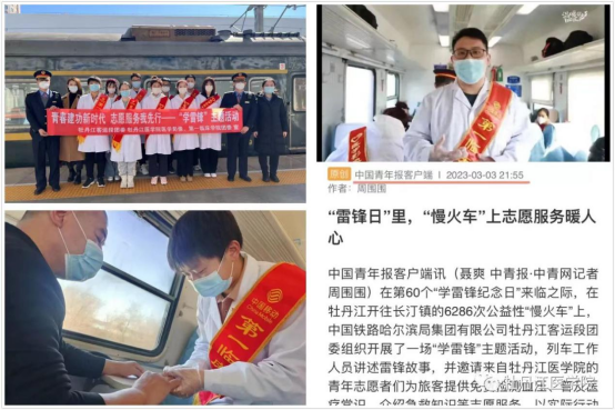 医学影像学院、第一临床医学院团委的志愿者服务队与中国铁路哈尔滨局集团有限公司牡丹江客运段团委联合开展了一场“学雷锋”主题活动,志愿者们分别来到了中国铁路4065次、4066次列车上,他们结合平时所学,为车上的乘客普及医疗常识,重点介绍了急救及高血压等疾病的预防和应对办法,用实际行动弘扬雷锋精神,传播正能量。本次活动受到社会或相关媒体关注,中国青年报客户端进行了报道。