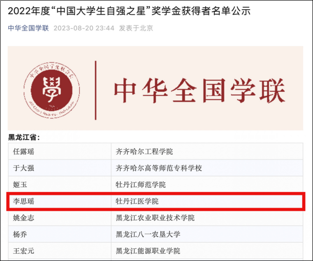 “2023牡丹江医学院首届励志之星荣誉称号”