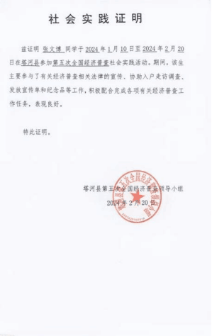社会实践是每一个大学生必须拥有的一段经历,为了响应学校和学院的号召,23级麻醉6班张文博同学利用寒假,在2024年的1月10日至2月20日期间,主动参加了塔河县经济社会调查中心开展的塔河县第五次全国经济普查工作。经济普查是我国重大国情国力调查,是国家获取国民经济数据的重要手段,对于全面摸清我国经济社会发展状况,加强和改善宏观调控,具有重大而深远的意义。