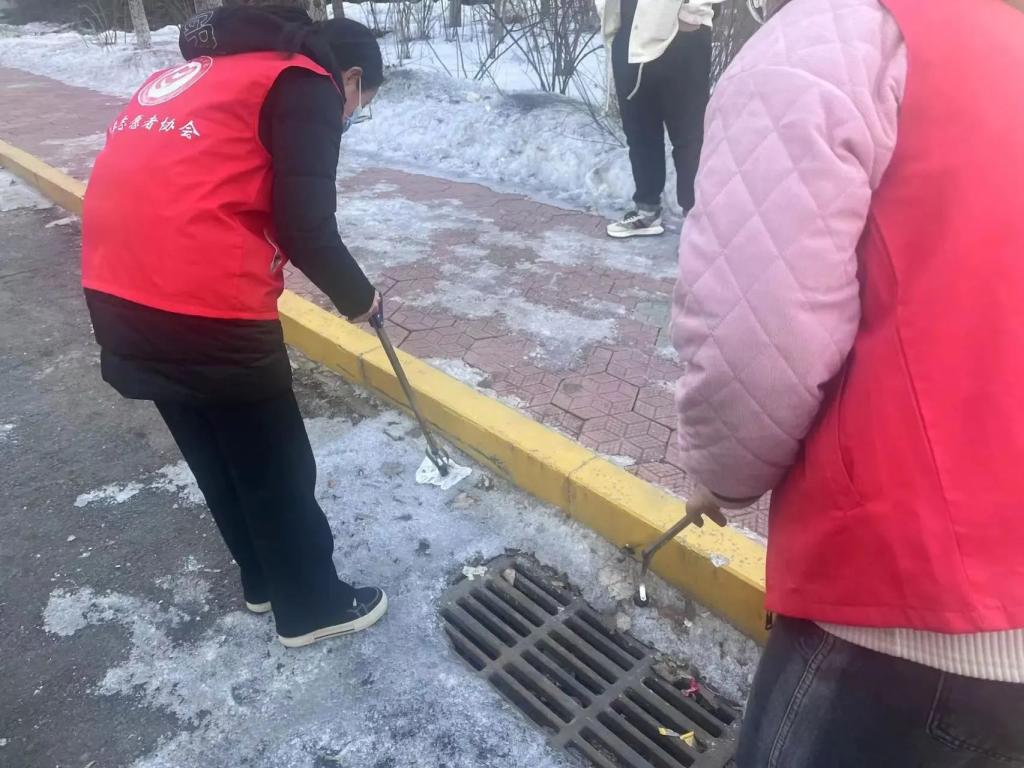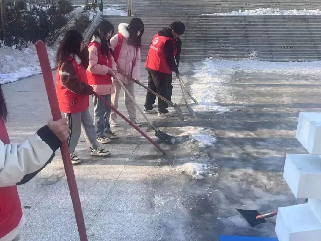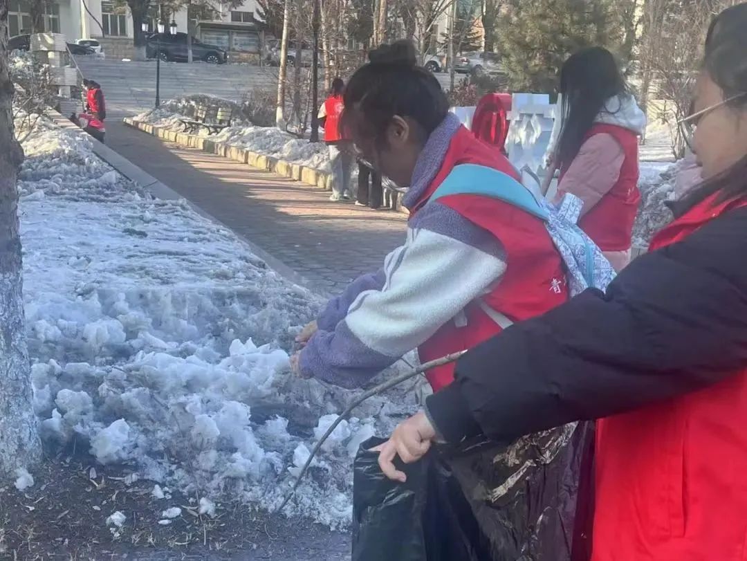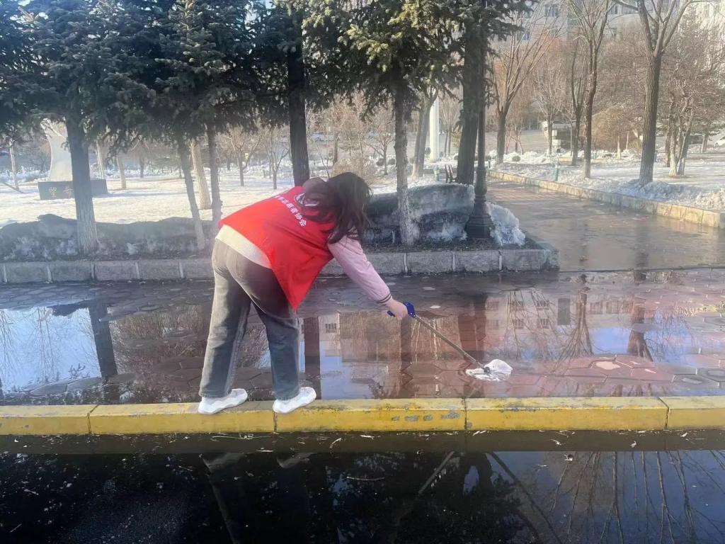 志愿者们身穿红马甲,手持清洁工具,分工明确,用实际行动做美化校园的示范者、实践者,他们有的弯腰捡拾路边的废纸和塑料包装,有的仔细清理花坛中的落叶和杂草,还有的铲去公共设施周围的冰雪,校园的主要道路和广场、教学楼周边、图书馆等区域都闪耀着一抹鲜艳的志愿红。